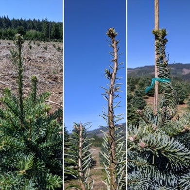 Let’s start at the top of the tree . In this image you have 3 different tree tops or leaders as they are known in the field. In the first two pictures you see two leaders vying for the top stop, the place of honor holding up your Christmas star or angel. Unfortunately, only one can win. When there are two leaders one must be cut back to allow the other to grow. Otherwise the tree won’t end up with the beautiful triangular Christmas tree shape we have all come to know and love. As you can see in the second and third parts of the image sometimes the leader doesn’t want to follow a straight path. When that happens we go around and tie a bamboo stake to the leader to help it find it’s way, insuring our trees stand tall and straight.
