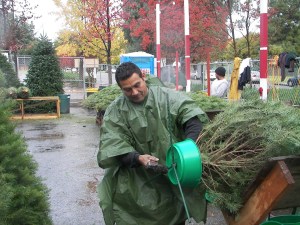 A Santa & Sons employee hammers a stand onto a Christmas Tree
