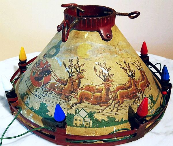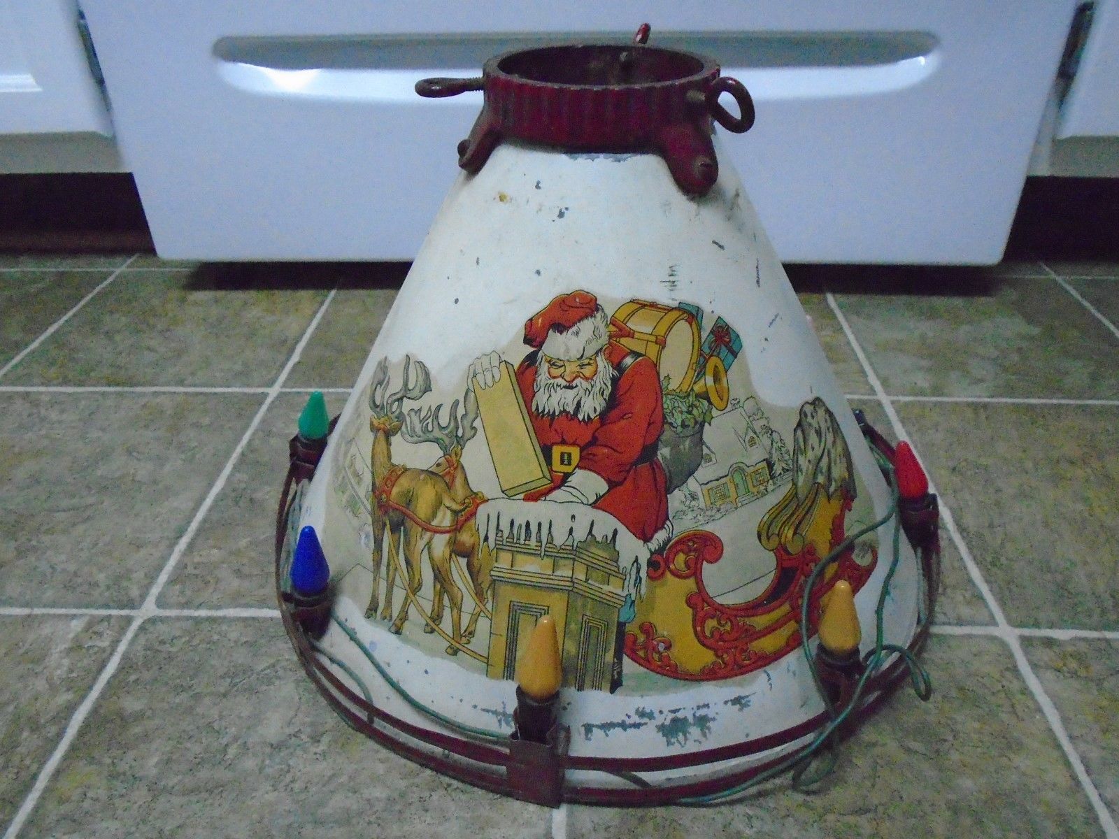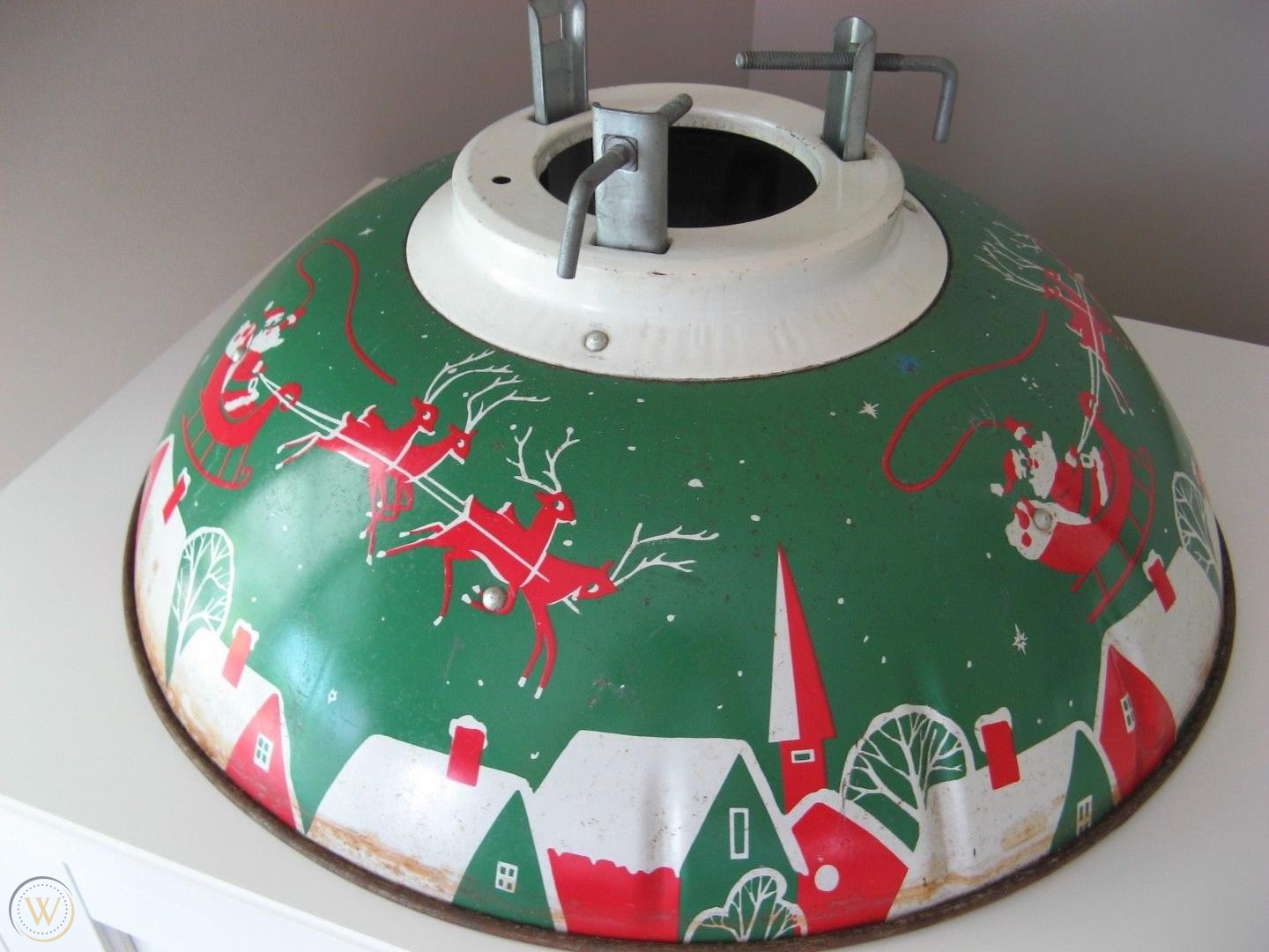 The next trend in Christmas Tree Stands included lithographed metal cones on the outside, and being wired for lights. These lithographed stands continued to be made into the 80’s. Due to the thin tin being easily dented or rusting, stands of this style that are still in usable condition are still highly prized by vintage collectors the world over. Unfortunately, like many of their cast iron predecessors, they also had a set collar size that limited the size range of tree they could hold. In the 1950’s commercial production of aluminum trees began. These trees were widely popular for a short time, usually paired with a rotating color light and having a built in stands that didn’t require any additional support.